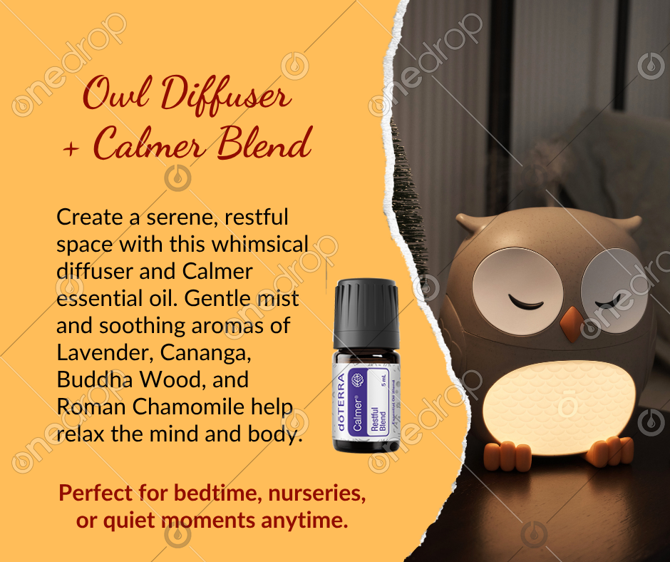 Bring a hoot of calm to your space! 🦉✨ The Owl Diffuser’s gentle glow and quiet mist fill the air with the soothing aroma of Calmer Restful Blend. Perfect for bedtime, nurseries, or cozy corners, this duo creates a peaceful, whimsical retreat wherever you go. Add a few drops of Calmer and let tranquility take flight!