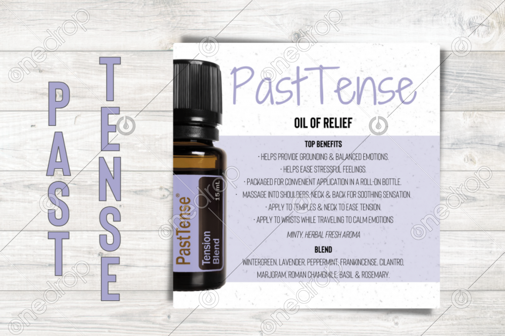 Square infographic with benefits & usage tips of Past Tense Essential Oil Blend.