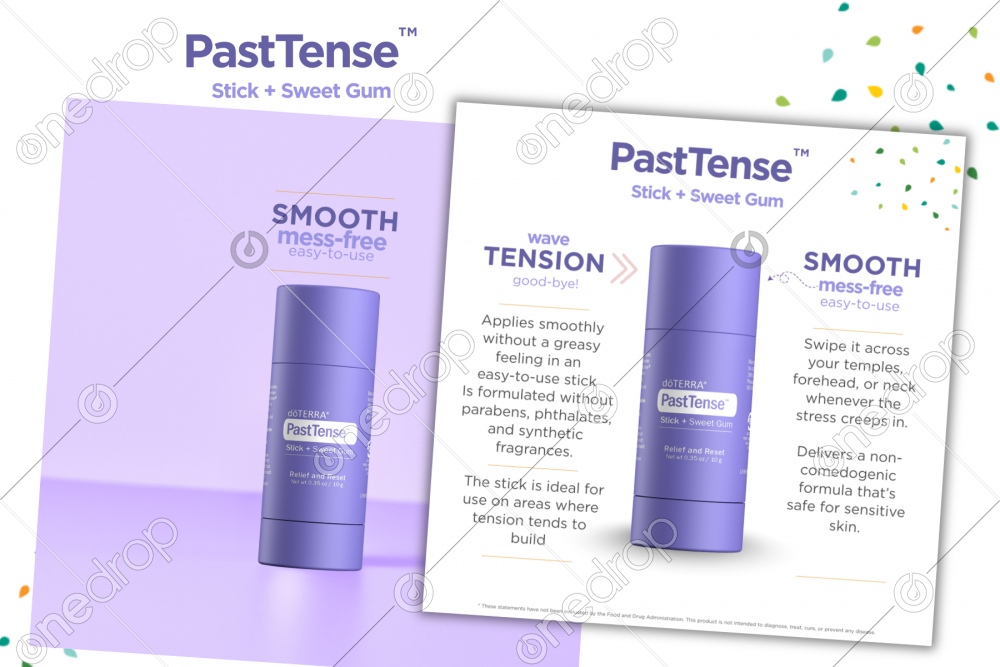PastTense Stick + Sweet Gum is a mess-free, easy-to-use stick that can be conveniently applied throughout the day. It combines the classic PastTense® essential oil blend— Wintergreen, Lavender, Peppermint, Frankincense, Cilantro, Roman Chamomile, Marjoram, Basil, and Rosemary—with Sweet Gum essential oil, which is naturally high in beta-caryophyllene, a compound known for its calming aroma. The stick is ideal for use on areas where tension tends to build, such as the forehead, temples, and back of the neck.