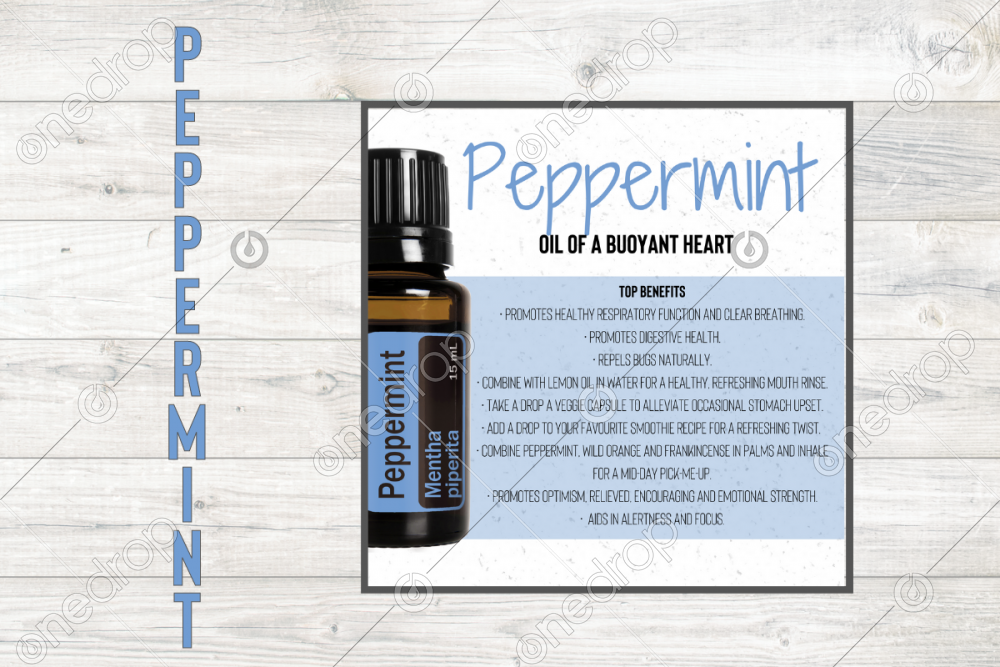 Square infographic with benefits & usage tips of Peppermint Essential Oil.