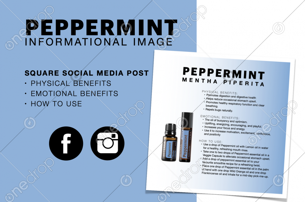 Square Social Media Image with Physical Benefits, Emotional Benefits + How to Use for Peppermint Essential Oil