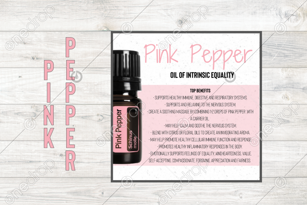 Square infographic with benefits & usage tips of Pink Pepper Essential Oil.