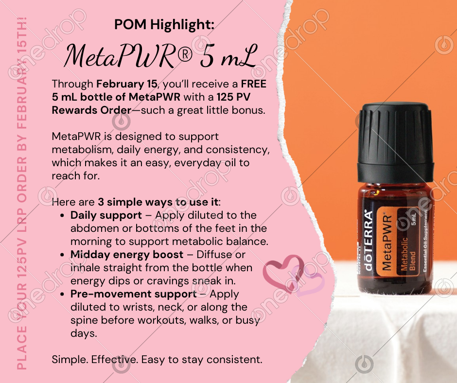 Through February 15, you’ll receive a FREE 5 mL bottle of MetaPWR with a 125 PV Rewards Order—such a great little bonus.