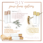 - DIY Perfume Roller Blend Recipes with image of 2 white glass 10mL rollers with rose gold, bronze and gold caps, soft marble bronze frame and flat-lay dried florals