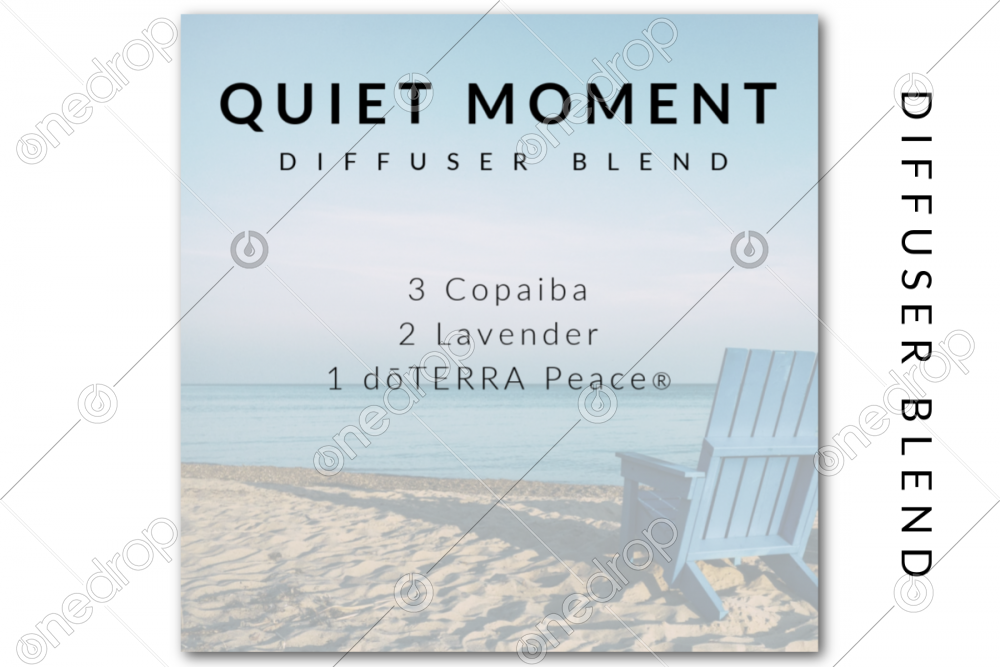 This square graphic features the Quiet Moment diffuser blend recipe with Copaiba, Lavender, and Peace with a photo background.