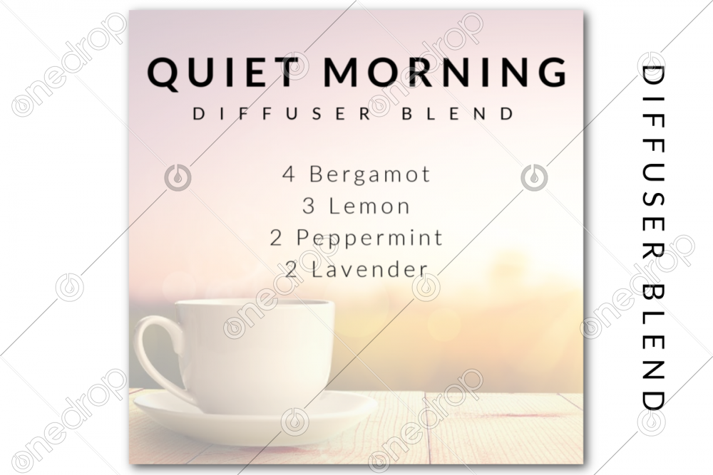This square graphic features the Quiet Morning diffuser blend recipe with Bergamot, Lemon, Peppermint, and Lavender with a photo background.