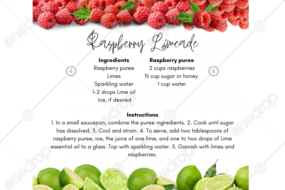 1. In a small saucepan, combine the puree ingredients. 2. Cook until sugar has dissolved. 3. Cool and strain. 4. To serve, add two tablespoons of raspberry puree, ice, the juice of one lime, and one to two drops of Lime essential oil to a glass. Top with sparkling water. 5. Garnish with limes and raspberries.