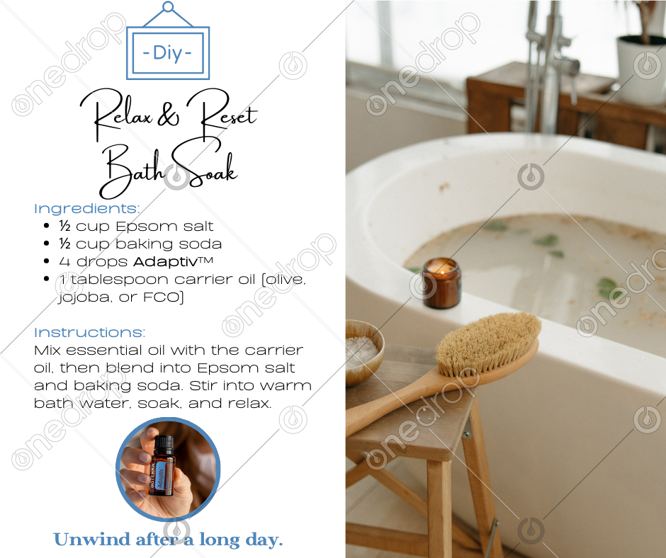 ➡️ Mix Adaptiv™ with your chosen carrier oil, then blend into Epsom salt and baking soda. Stir into warm bath water, sink in, and let the stress fade away. ✨
