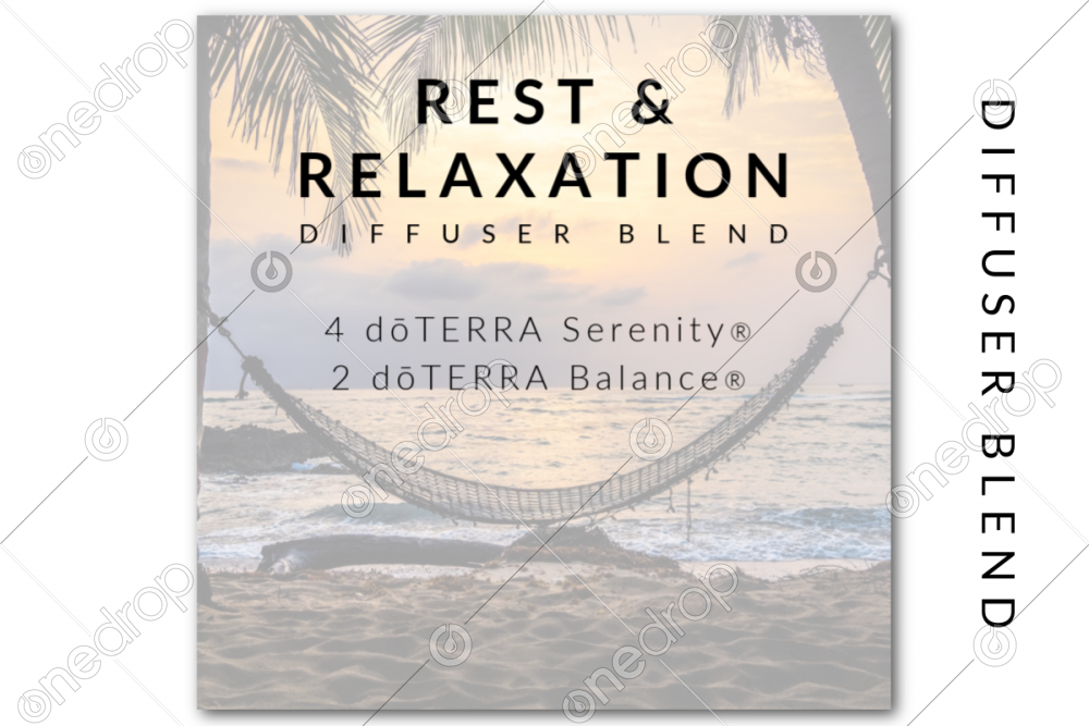 This square graphic features the Rest & Relaxation diffuser blend recipe with Serenity and Balance with a photo background.