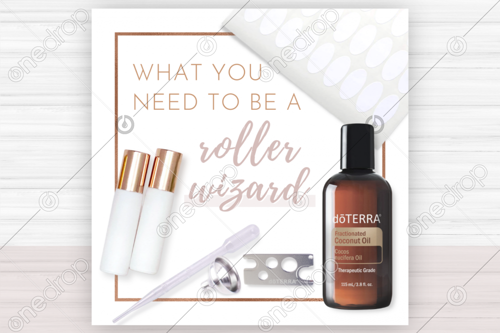 - Features 2 flat-lay white roller bottles rose gold caps, dōTERRA Fractionated Oil, orifice remover tool, pipette, a sheet of white sticker labels, and mini stainless steel funnel