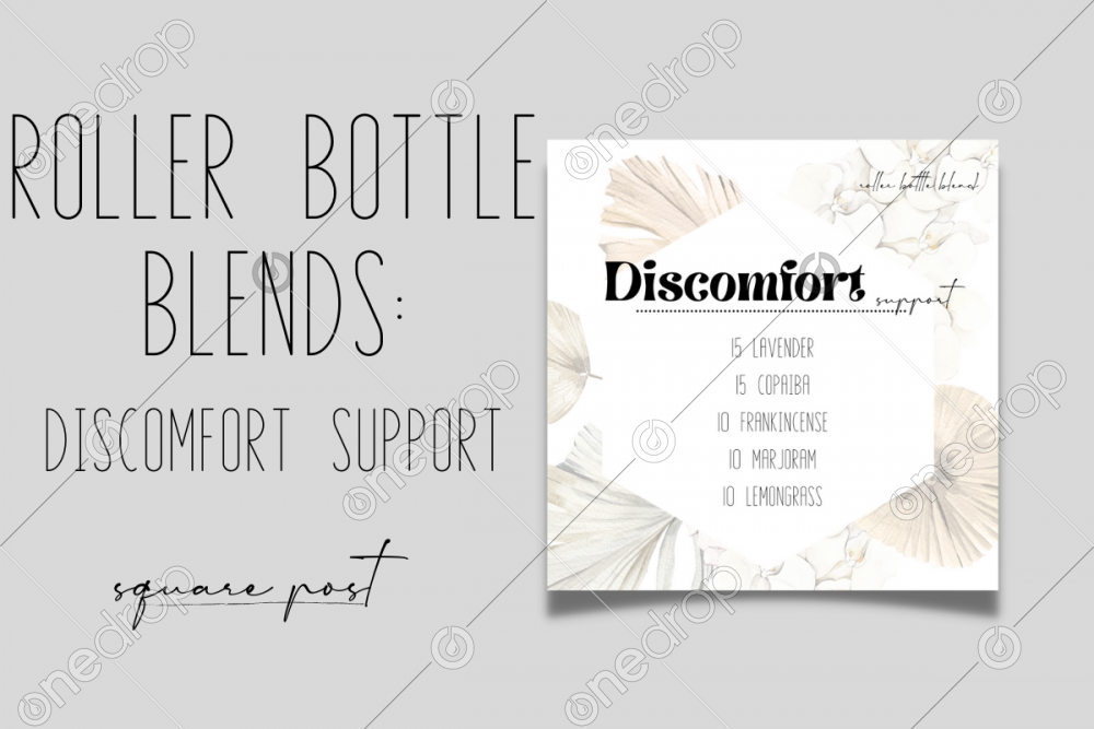 Square post detailing the oils used in the roller that supports all types of body discomfort. Watercolor, boho, floral.