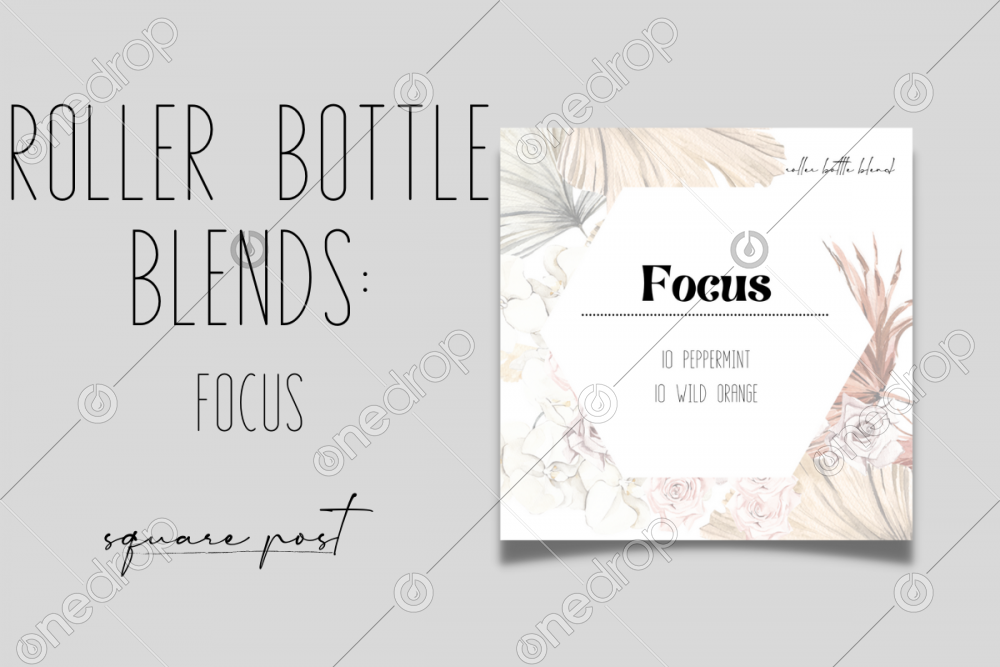 Square post detailing the oils that make the roller that promotes concentration and focus. Watercolor, boho, floral.