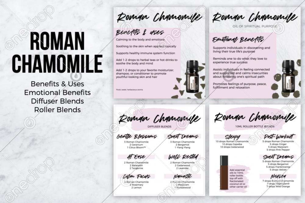 Square post graphics for Roman Chamomile, perfect for social media: Benefits & uses Emotional benefits Diffuser blends Roller bottle blends 4 square graphics **please watermark images to protect your investment If you have a request or comment, please use “provide feedback” to email me. If you want me to address you specifically, please include your contact info for a reply.