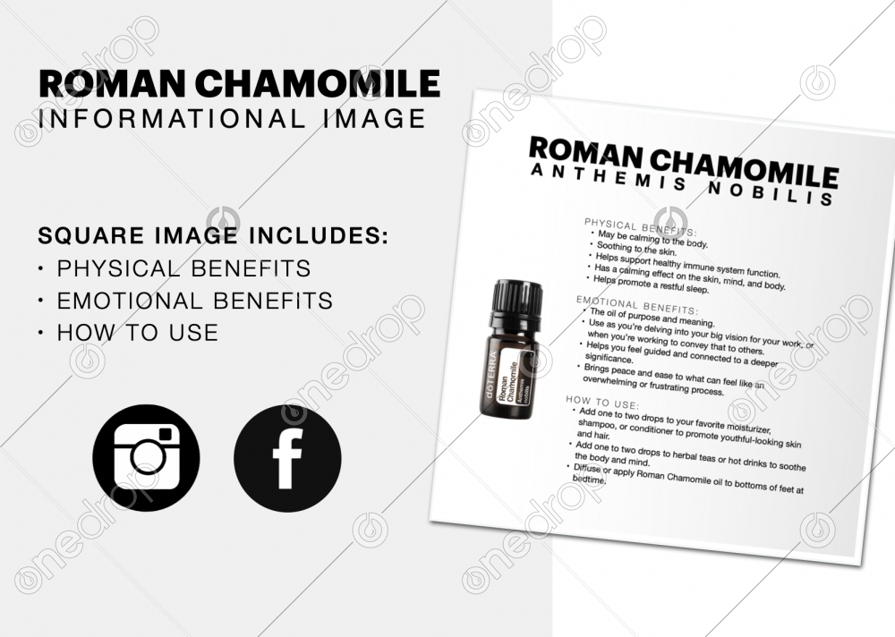 Square Social Media Image with Physical Benefits, Emotional Benefits + How to Use for Roman Chamomile Essential Oil