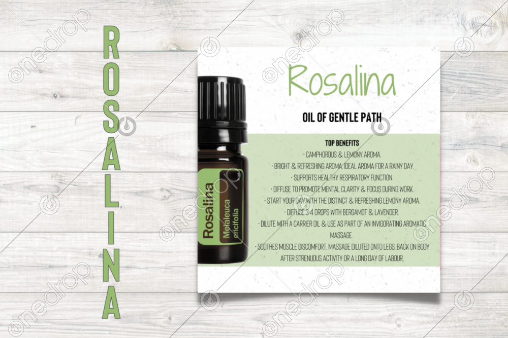 Square infographic with benefits & usage tips of Rosalina Essential Oil.