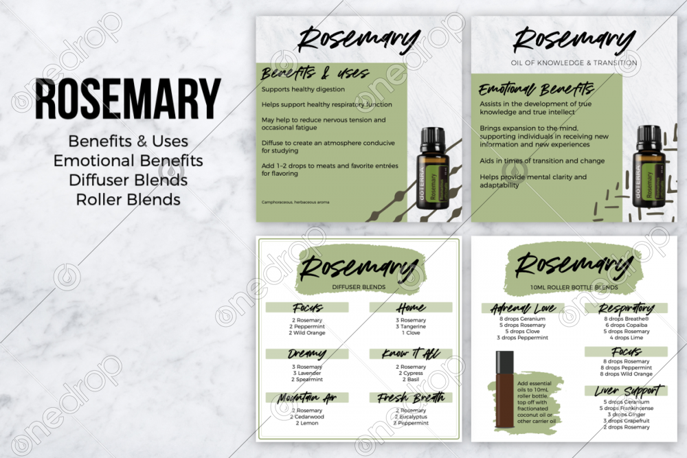 Square post graphics for Rosemary, perfect for social media: Benefits & uses Emotional benefits Diffuser blends Roller bottle blends 4 square graphics **please watermark images to protect your investment If you have a request or comment, please use “provide feedback” to email me. If you want me to address you specifically, please include your contact info for a reply.