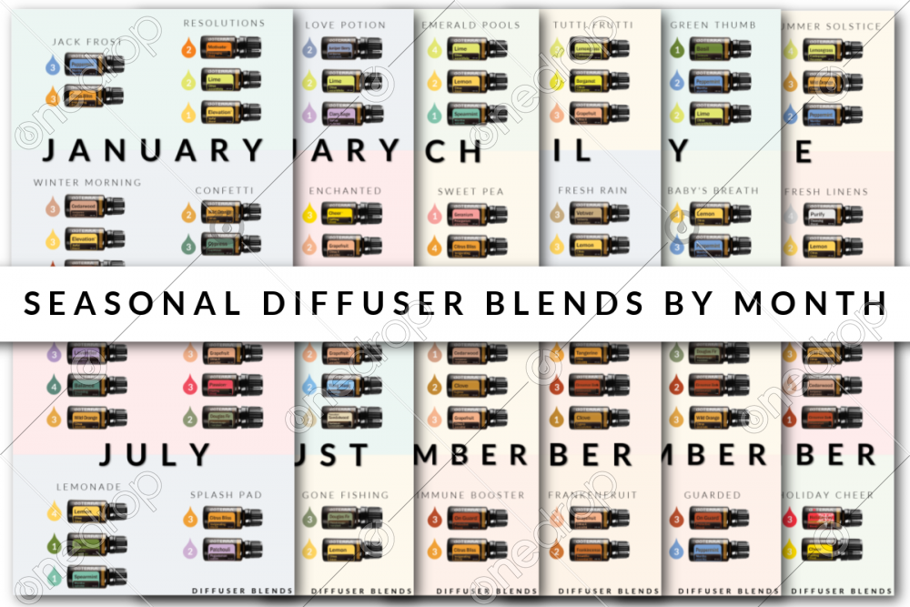 This graphic bundle includes 12 images, one for each month. Each graphic displays 4 simple diffuser blends/recipes, which are perfect for the specific season/month. Each diffuser recipe utilizes 2 or 3 different oils or blends.