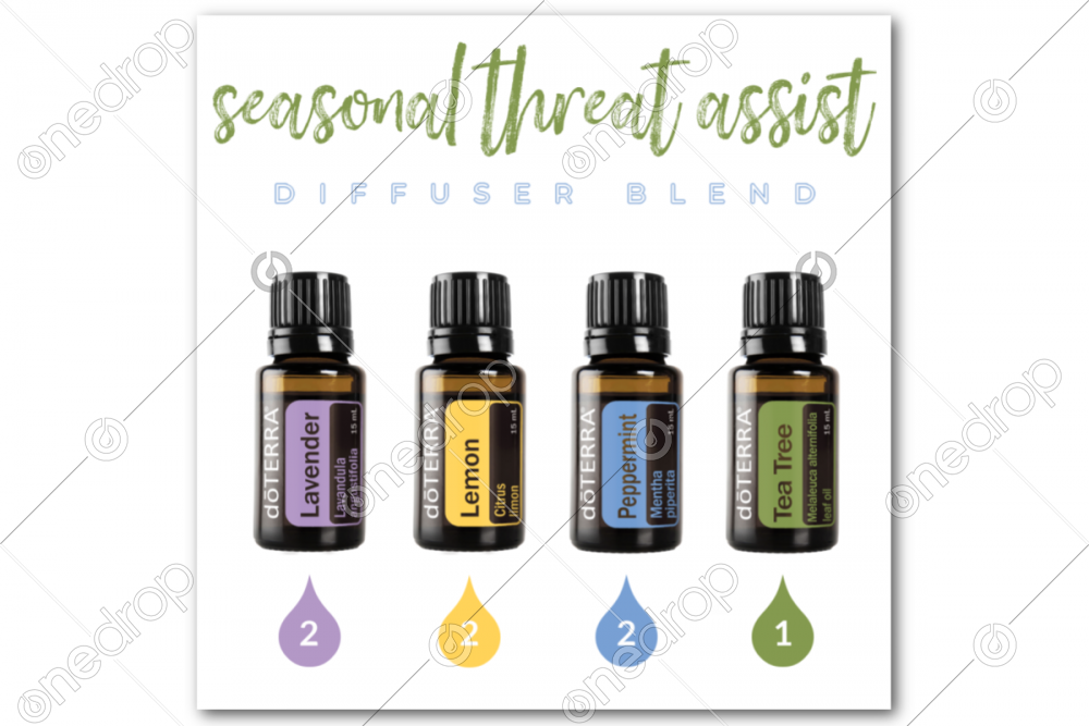This square graphic features the Seasonal Threat Assist diffuser blend recipe with Lavender, Lemon, Peppermint, and Tea Tree.