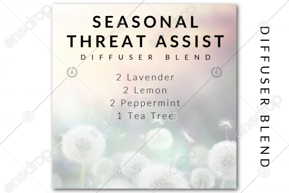 This square graphic features the Seasonal Threat Assist diffuser blend recipe with Lavender, Lemon, Peppermint, and Tea Tree with a photo background.