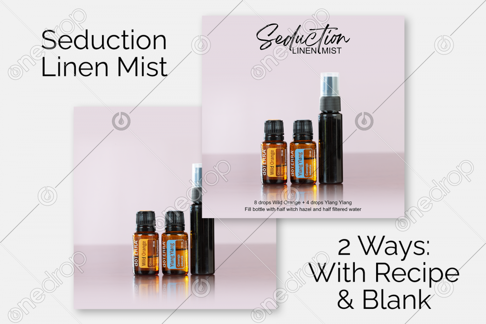 High resolution square image of the Seduction linen mist blend with Wild Orange, Ylang Ylang, and 1oz spray bottle. One image, two ways: With name and recipe Blank Find more from this collection HERE 📌Please make sure to watermark images with your name/logo to protect your investment and make sure One Drop contributors are fairly compensated for their work. Kindly direct your sharers back to One Drop to download their own 😀
