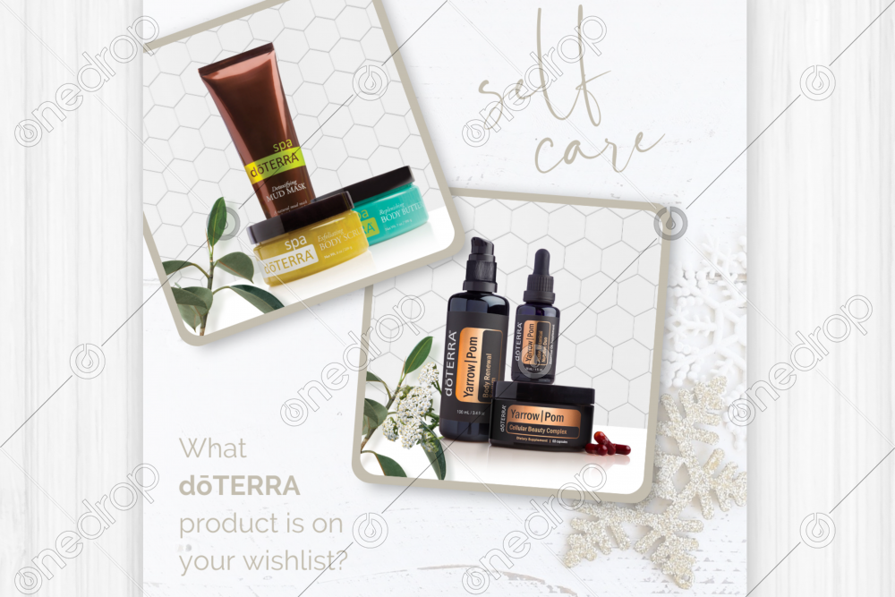 - Includes original images of the dōTERRA Spa Luxury Set (Detoxifying Mud Mask, Exfoliating Body Scrub and Replenishing Body Butter) and The Yarrow | Pom collection (oil, body serum and glowing skin supplement)