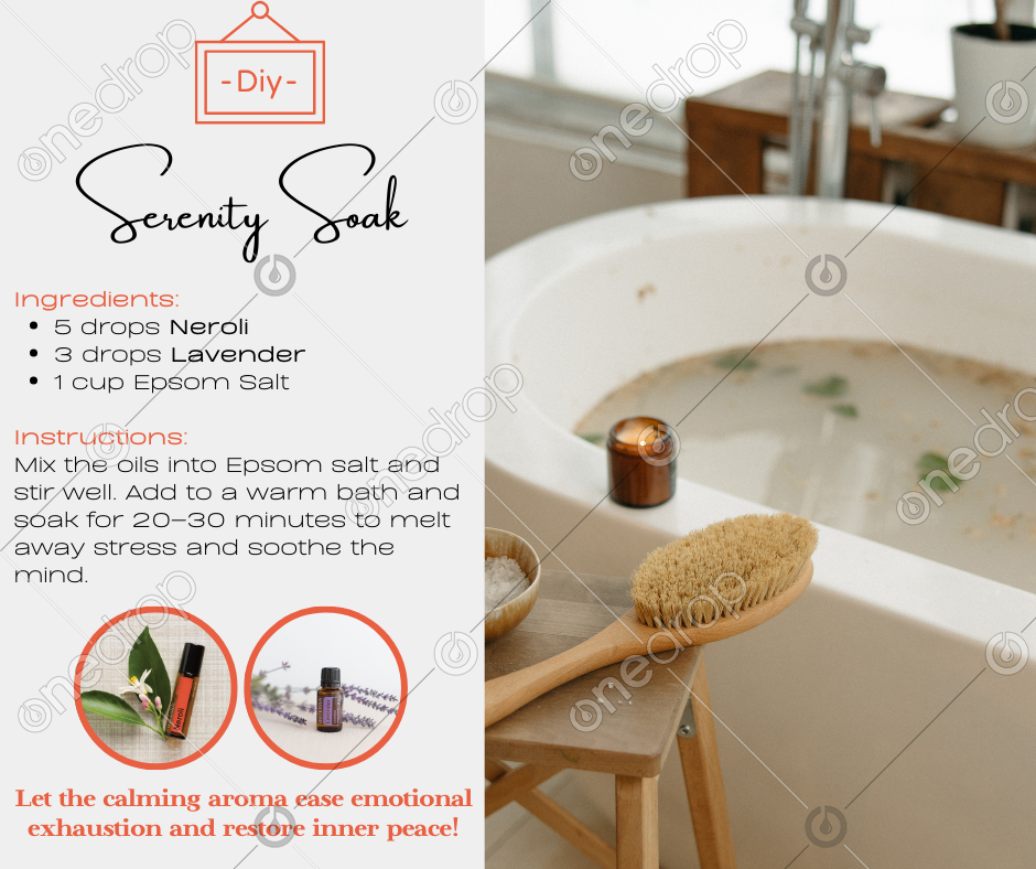 Mix the oils into Epsom salt and stir well. Add to a warm bath and soak for 20–30 minutes to melt away stress and soothe the mind.