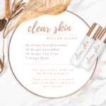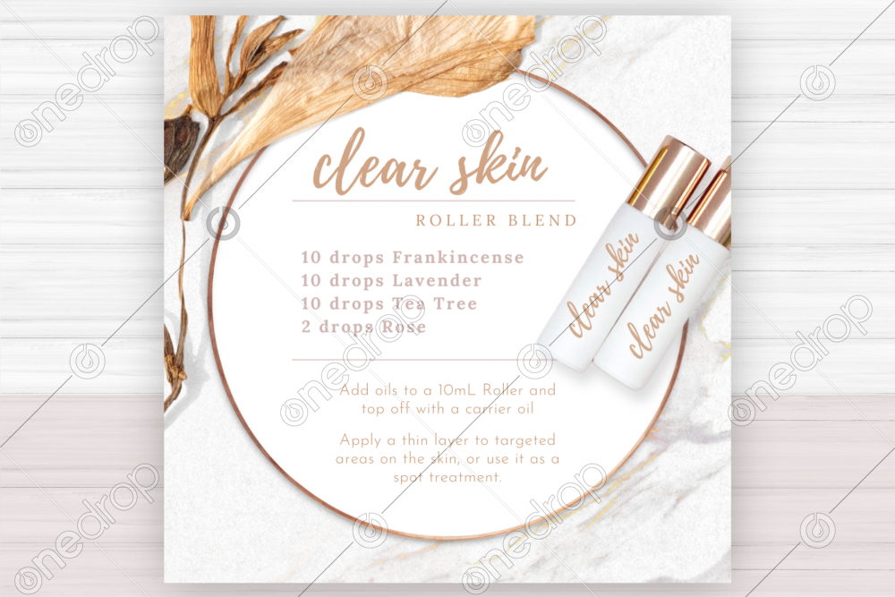 - Roller blend recipe with image of 2 white glass 10mL rollers with rose gold caps and custom labels, soft marble background, and flat-lay dried florals