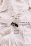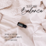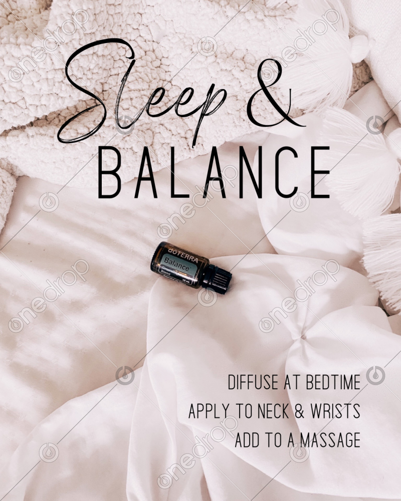 - Graphics showing the applicable uses of Balance Essential Oil Blend to promote restful sleep.