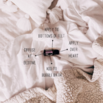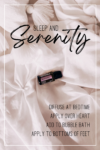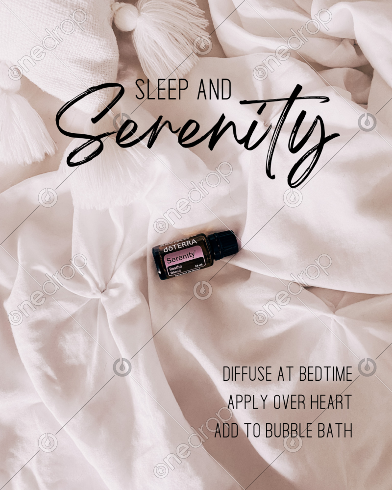 - Graphics showing the applicable uses of Serenity Essential Oil Blend to promote a calming environment for sleep.