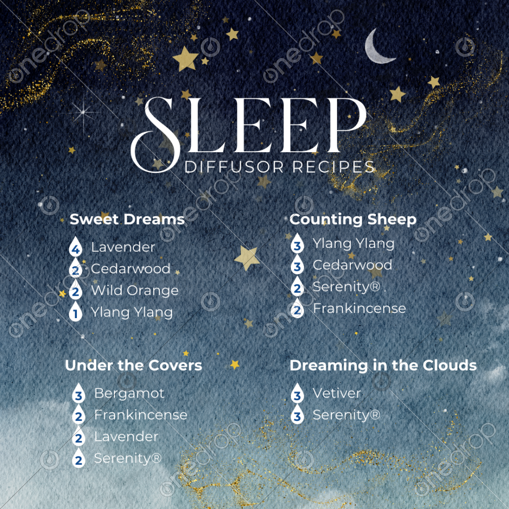 Square graphic with four diffuser recipes for sleep Watercolor night sky with glitter and gold stars Social media posts Blog post images Pintrest pins Instagram Stories Facebook Stories Texting WhatsApp