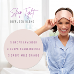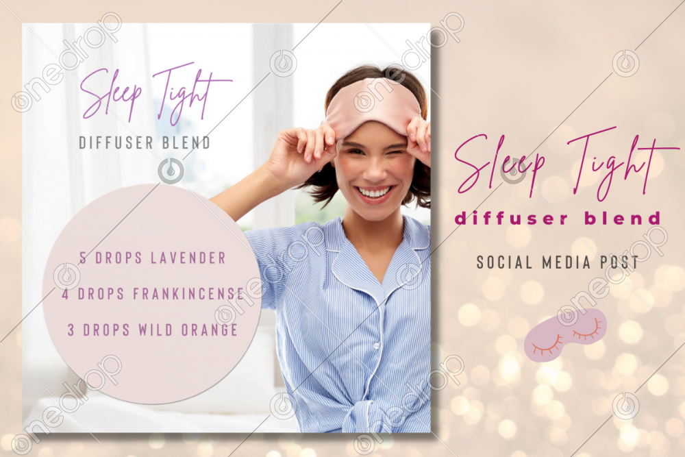 A social media post fgeaturing the 'Sleep Tight Diffuser Blend' (see below), alongside an image of a lady getting ready for bed.