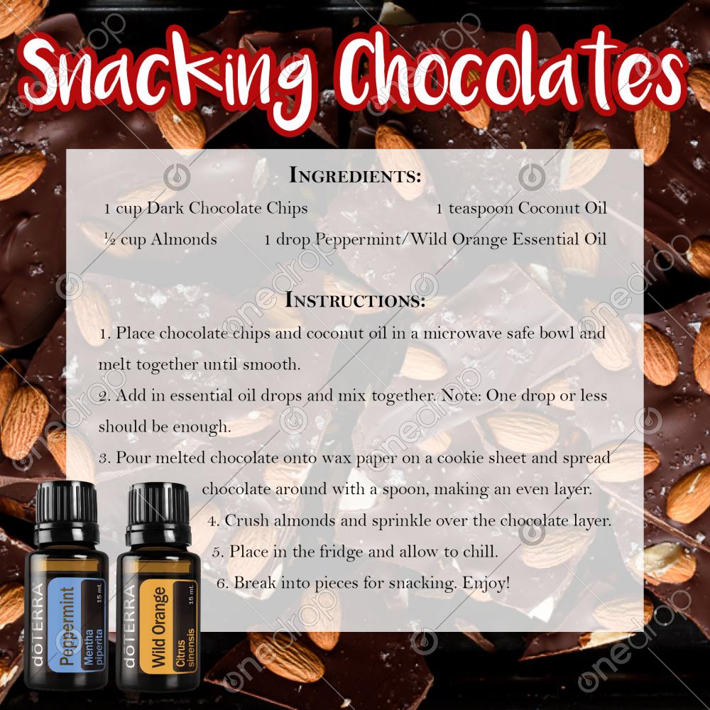 Snacking Chocolates graphic with recipe and bottles of Peppermint and Wild Orange.