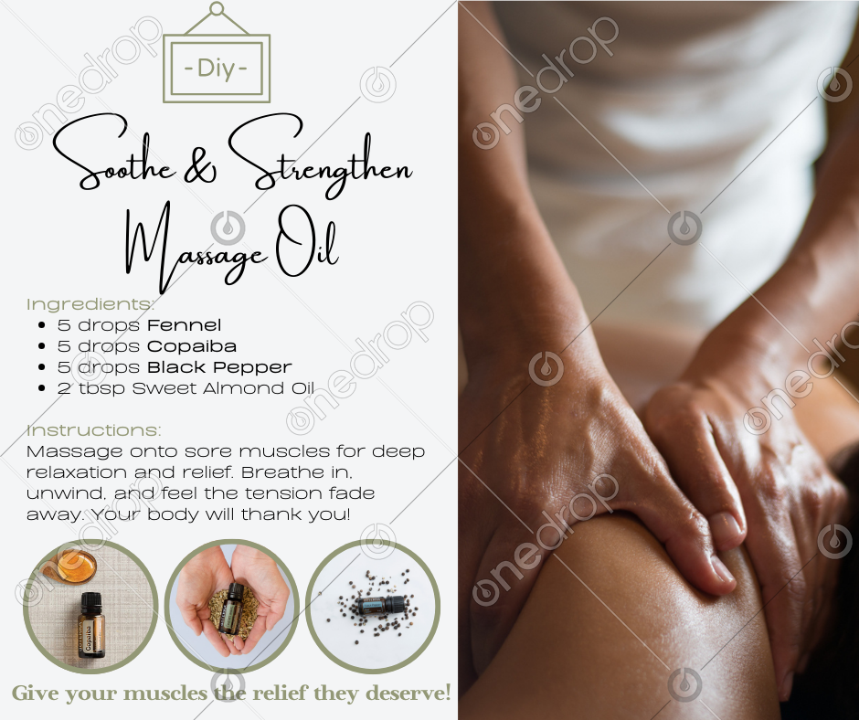 Give your muscles the relief they deserve with Soothe & Strengthen Massage Oil! This warming, restorative blend of Fennel, Copaiba, and Black Pepper works deep to ease tension, support circulation, and promote relaxation. Whether it’s after a tough workout or a long day, this blend melts away discomfort and restores movement.