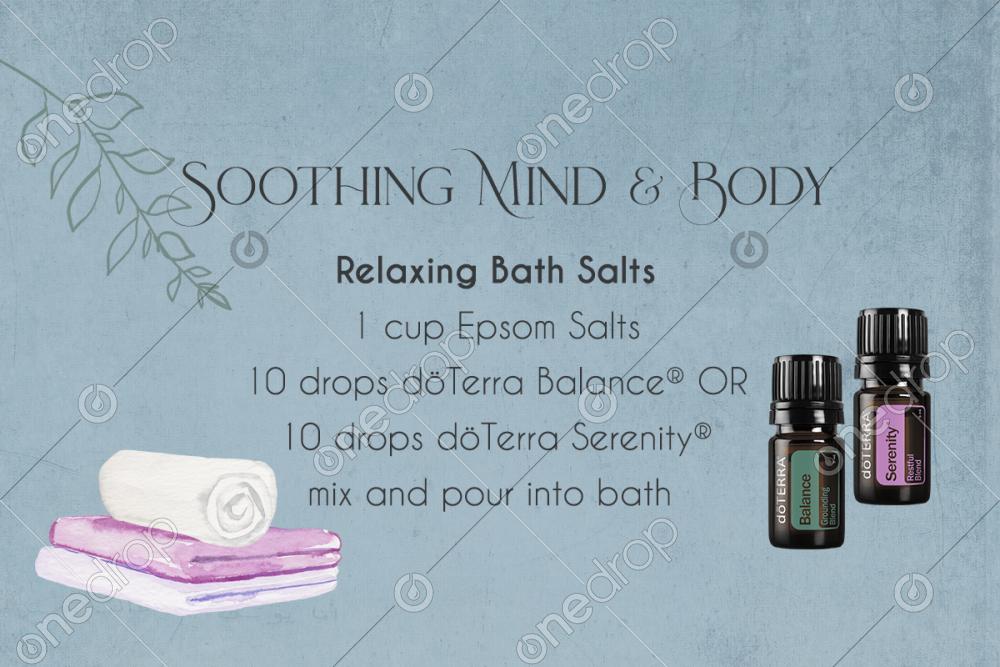 Two social media posts featuring essential oils Balance® and Serenity® to create a soothing bath salt. The mind and body connection are supported with this recipe.