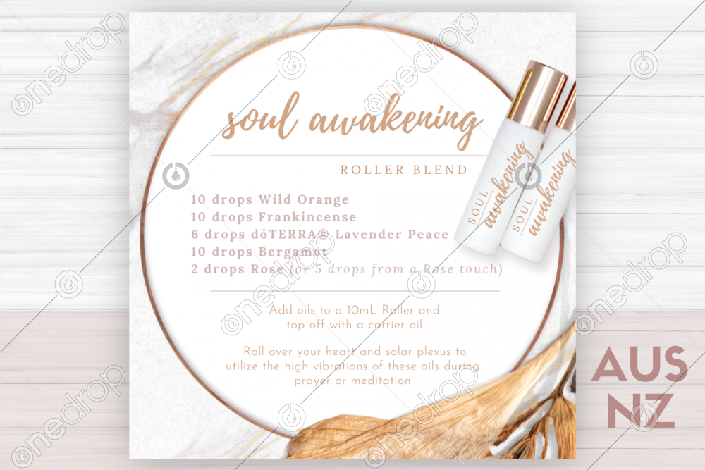 • Roller blend recipe with image of 2 white glass 10mL rollers with rose gold caps and custom labels, soft marble background, and flat-lay dried florals