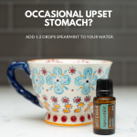 An image with a glass and bottle of spearmint with directions to use to ease the discomfort of an upset stomach.