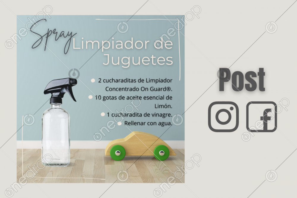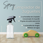Imagen en formato cuadrado para Post de Instagram / Facebook con la receta para prepara tu propio spray limpiador de juguetes natural.