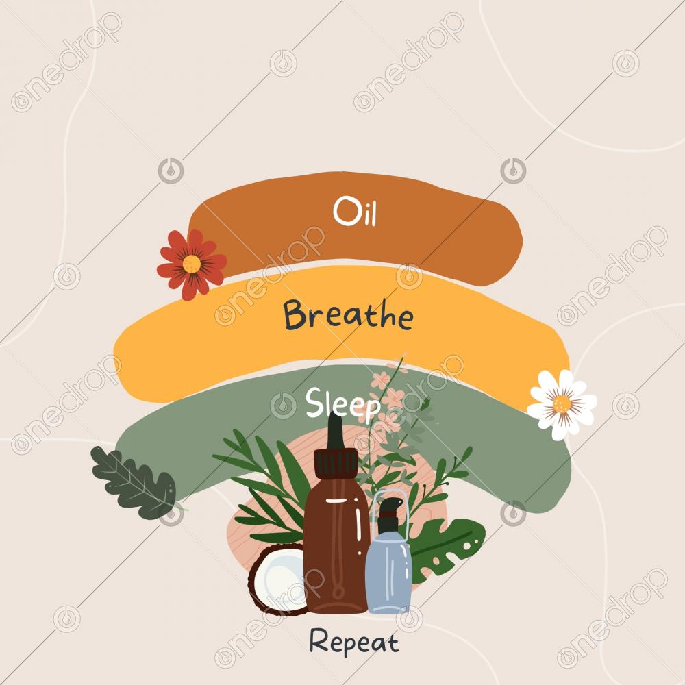 Square quote graphic "Oil, Breathe, Sleep, Repeat" featuring hand drawn essential oil graphics