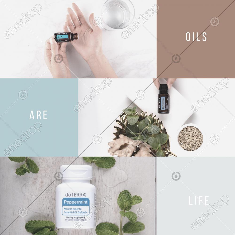 Square social media quote graphic "Oils are Life" featuring Air-X, Digest Zen and Pepperming soft gels
