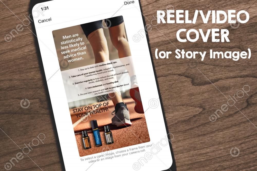 Reel Idea: Take a picture/video or use a free stock image of yourself/a man working out or eating a healthy meal with overlaid text "How do you stay on top of your health?". Then (depending on how long your video audio is), either put "See top 5 tips in description" or bullet point them with overlaid text. Make sure you upload this cover image before sharing. If putting on your feed too, remember to move the cropped image to where you want it.