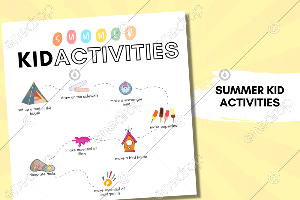 Help your community keep their kids busy with ideas from this fun summer activity graphic. White background for easy adjustment for IG Stories. Essential Oil Slime Add all ingredients (except contact solution together and mix. Add contact solution slowly and mix. Mix in essential oils. Enjoy! Essential Oil Fingerpaints In a medium pot, whisk together cold water and cornstarch. Heat over medium heat, stirring often, until the mixture thickens. Remove from the heat and let cool. Pour the mixture into plastic bottles (or chosen containers) and add a different color of food coloring to each bottle, stirring until you achieve your desired color. Add a drop of essential oil to each bottle of paint and stir. Be sure to choose gentle essential oils that are safe for children. (Examples?) Popsicles (Banana Coconut with Lemon Essential Oil) Blend bananas, coconut cream, vanilla extract, and Lemon oil until smooth. Pour in popsicle molds. Freeze for 3 hours (or until completely frozen) Enjoy!