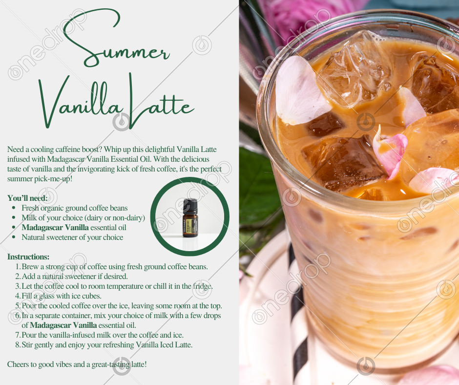 Need a cooling caffeine boost? Try this yummy Vanilla Latte infused with Madagascar Vanilla Essential Oil. With the delicious taste of Vanilla essential oil and the invigorating kick of fresh coffee, this iced beverage is the perfect summer pick-me-up.