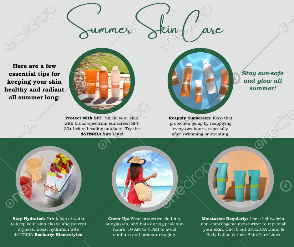 Moisturize Regularly: Hydrate your skin with a lightweight, non-comedogenic moisturizer to replenish moisture lost during sun exposure and keep your skin looking healthy and radiant. I suggest the doTERRA Hand and Body Lotion, as well as the doTERRA Skin Care Lines.