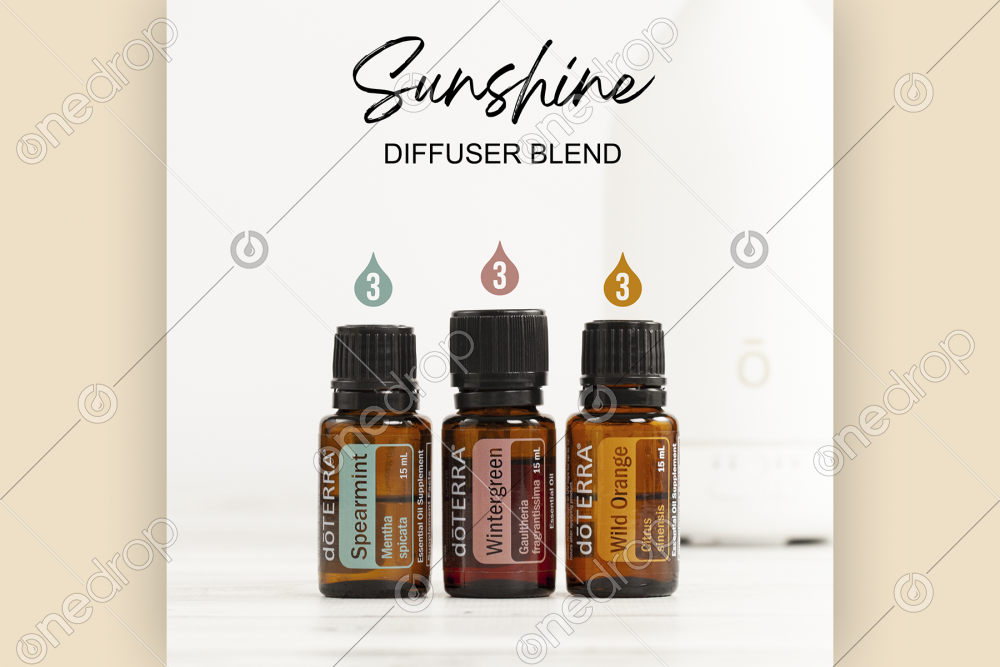 High resolution square picture of the Sunshine diffuser blend featuring Wintergreen + Wild Orange + Spearmint.