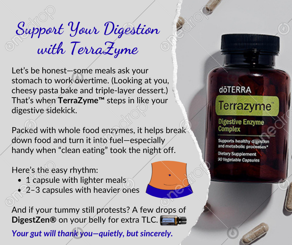 Upset stomach? Take 2 TerraZyme with water and add a few drops of DigestZen® topically. This dynamic duo helps calm and support digestion like magic. ✨