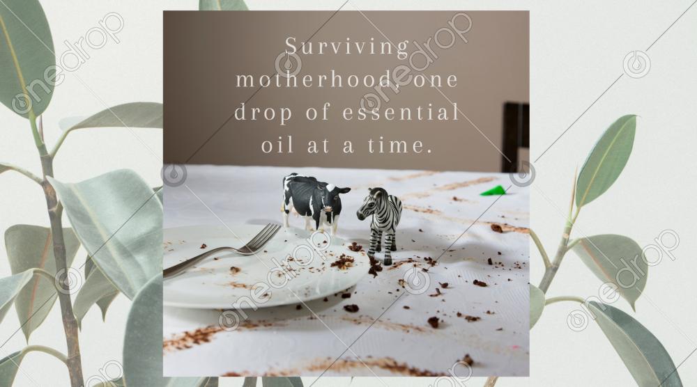 "Surviving motherhood, one drop of essential oil at a time." Witty Instagram quote graphic.