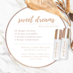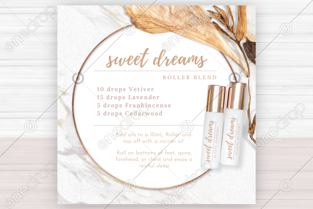 - Roller blend recipe with image of 2 white glass 10mL rollers with rose gold caps and custom labels, soft marble background, and flat-lay dried florals