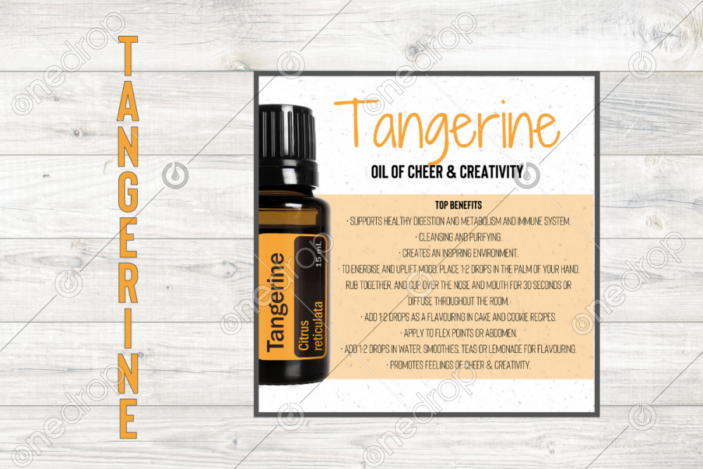 Square infographic with benefits & usage tips of Tangerine Essential Oil.