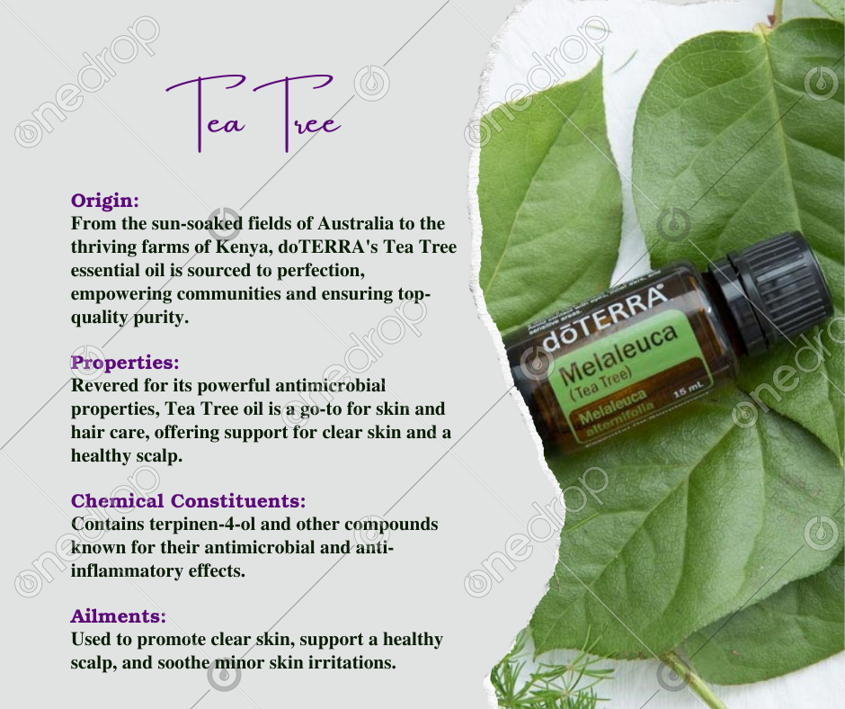 Native to the rugged terrain of Australia and the fertile lands of Kenya, Tea Tree essential oil is a powerhouse of cleansing properties. Its fresh, medicinal scent purifies the air, supports skin health, and boosts immunity.