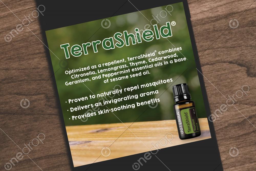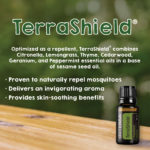 Optimized as a repellent, TerraShield® combines Citronella, Lemongrass, Thyme, Cedarwood, Geranium, and Peppermint essential oils in a base of sesame seed oil.